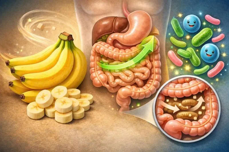 Chuối chứa chất xơ hòa tan (pectin) và tinh bột kháng, giúp cải thiện nhu động ruột. Các thành phần này còn đóng vai trò như nguồn “thức ăn” cho lợi khuẩn trong ruột, từ đó giúp duy trì hệ vi sinh ổn định. Nhờ đó, chuối không chỉ giúp giảm táo bón mà còn hỗ trợ hấp thu dinh dưỡng hiệu quả hơn.