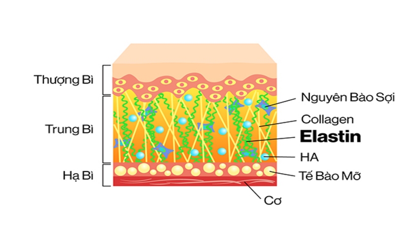 Elastin là một loại protein quan trọng trong lớp trung bì của da, đóng vai trò quyết định tính đàn hồi và khả năng phục hồi của mô da. Khi da bị kéo giãn, mạng lưới sợi elastin giúp da trở lại hình dạng ban đầu, thay vì bị biến dạng vĩnh viễn. Đây chính là lý do tại sao tác dụng của elastin rất quan trọng trong việc duy trì làn da săn chắc và đàn hồi.